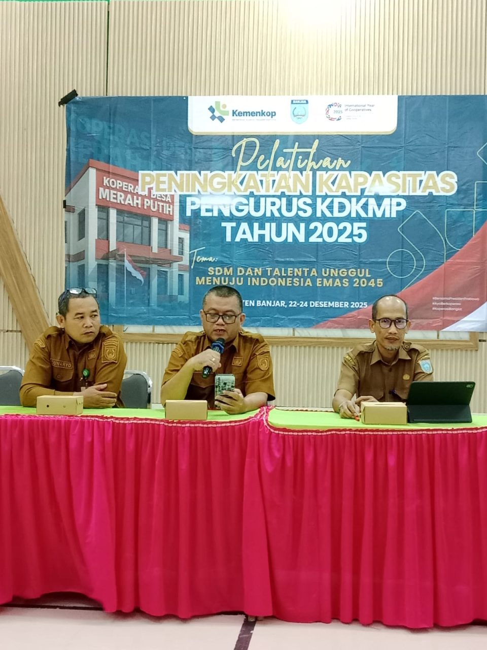 Pemerintah Kabupaten Banjar melalui Dinas Koperasi, Usaha Mikro, Perindustrian dan Perdagangan (DKUMPP) melaksanakan kegiatan Peningkatan Kapasitas Pengurus Koperasi Desa Merah Putih (KDMP) dengan tema “SDM dan Talenta Unggul Menuju Indonesia Emas 2045”. Kegiatan ini berlangsung selama tiga hari, mulai tanggal 22 hingga 24 Desember 2025, bertempat di Aula Kecamatan Sambung Makmur dan secara resmi dibuka oleh Sekretaris Kecamatan Sambung Makmur, Gusti Sufian Helmi, S.Kep., Ners. Dalam sambutannya, beliau menekankan pentingnya penguatan kapasitas pengurus KDMP sebagai motor penggerak pembangunan ekonomi masyarakat desa.